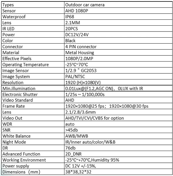 1080P AHD 2.0MP ,2.1mm lens